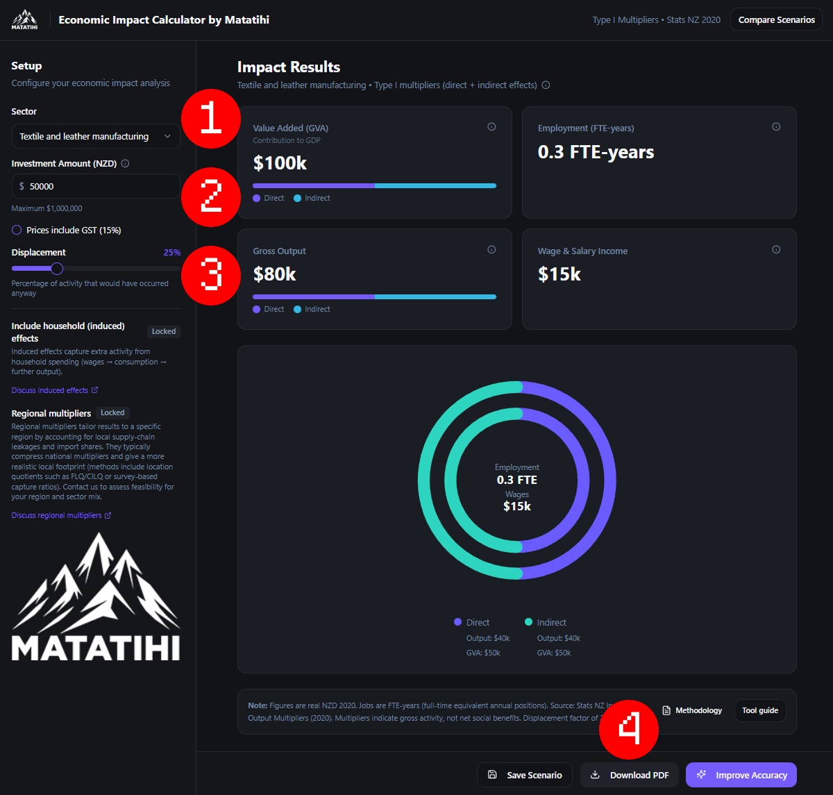 “Economic Impact Snapshot generated using Matatihi’s Economic Impact Snapshot Calculator (Type I multipliers, direct + indirect), based on Stats NZ Input–Output tables (year ended March 2020). Scenario run on [DATE].”